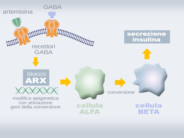 Fig. 1 - Conversione cellulare alfa-beta - Il farmaco antimalarico artemisina o il neurotrasmettitore GABA attivano i recettori GABA, i quali a livello intracellulare bloccano il fattore di trascrizione ARX, una chiave molecolare del processo di differenziazione delle cellule delle isole di Langherans. Si attivano di conseguenza meccanismi epigenetici di conversione delle cellule alfa in cellule beta secernenti insulina.